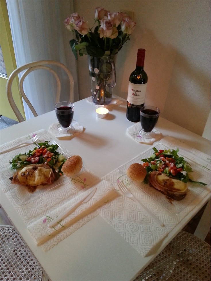 We had a lovely home cooked meal. How fancy are we with our plastic cutlery, plates and paper towel placemats?