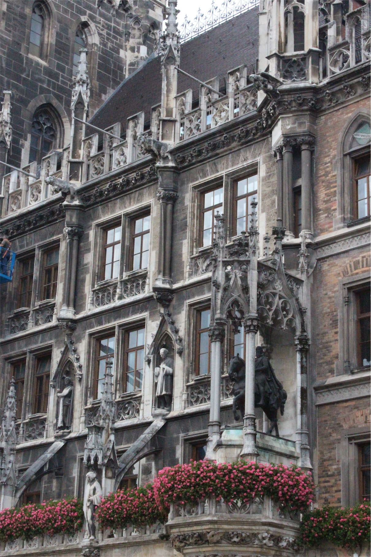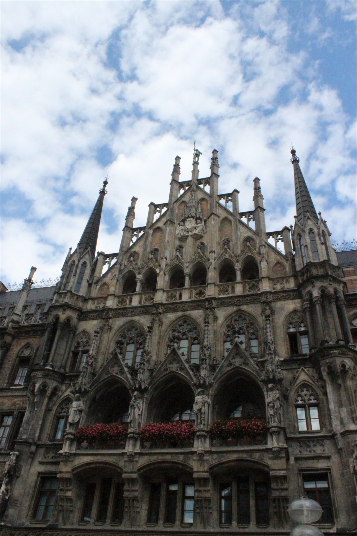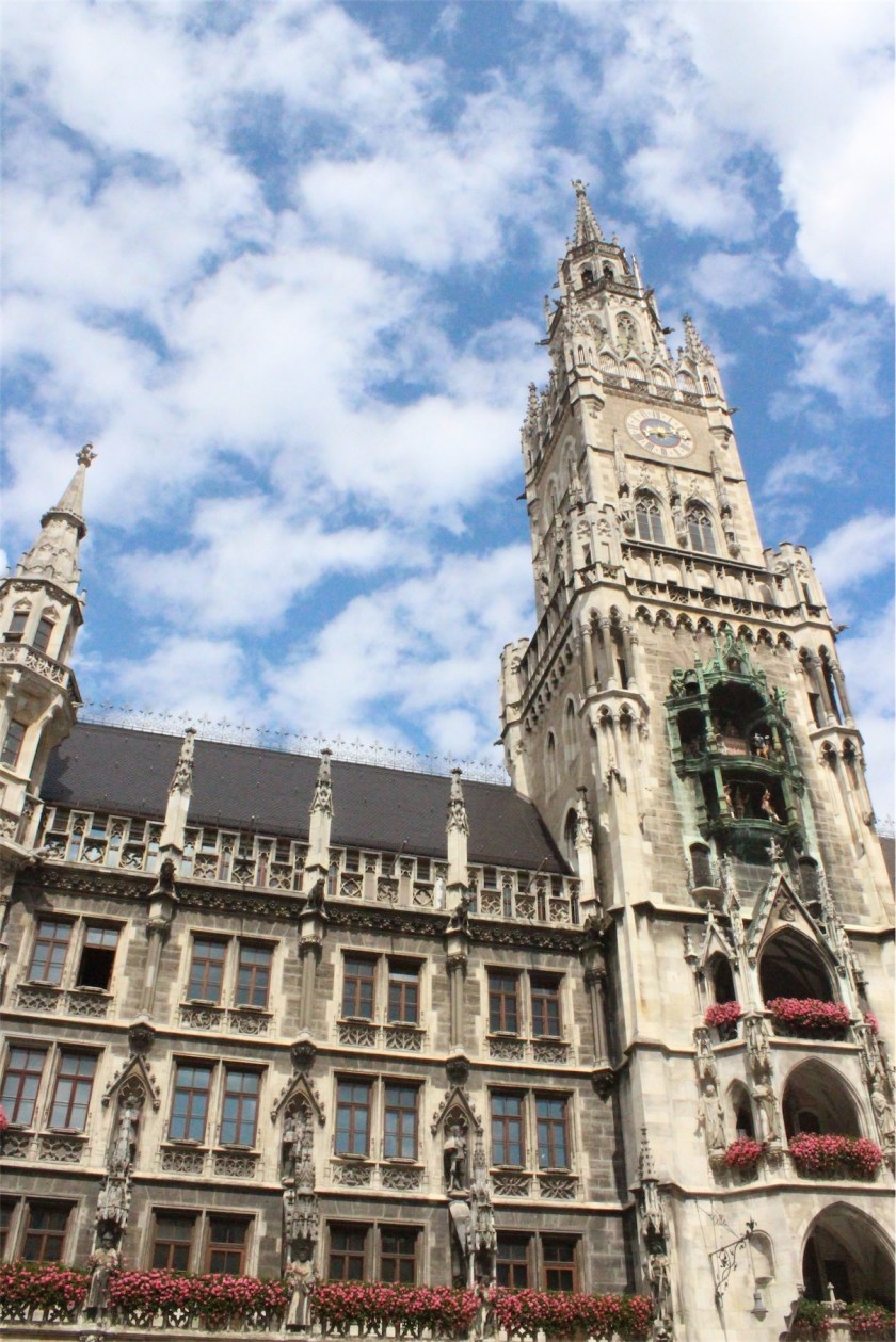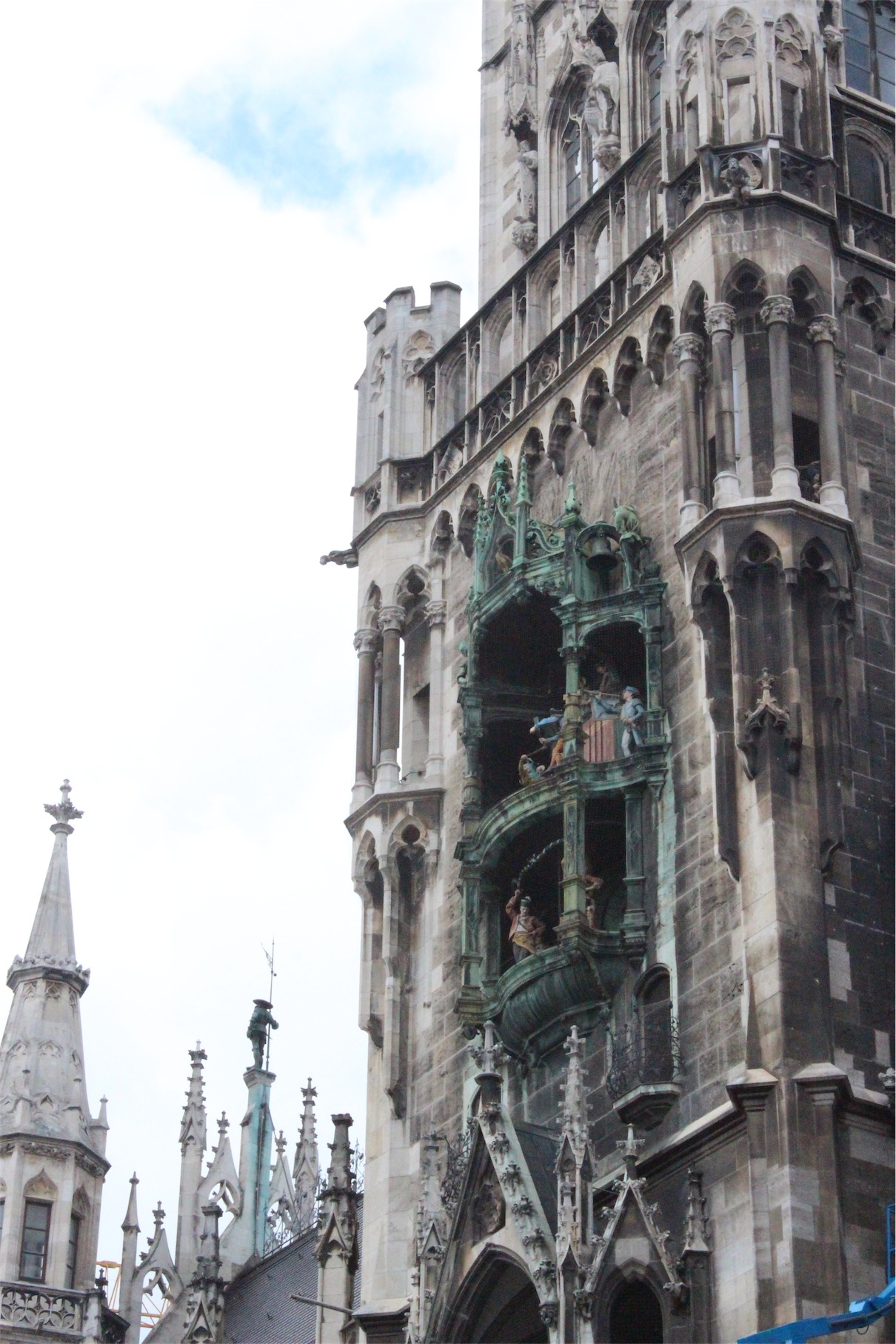 There are two town halls in Munich, the old (the white building), and the new, built in 1908. The New Town Hall has a very cool Glockenspiel which has 43 bells and 32 life-sized figures and every day it re-enacts two stories from the 16th century.