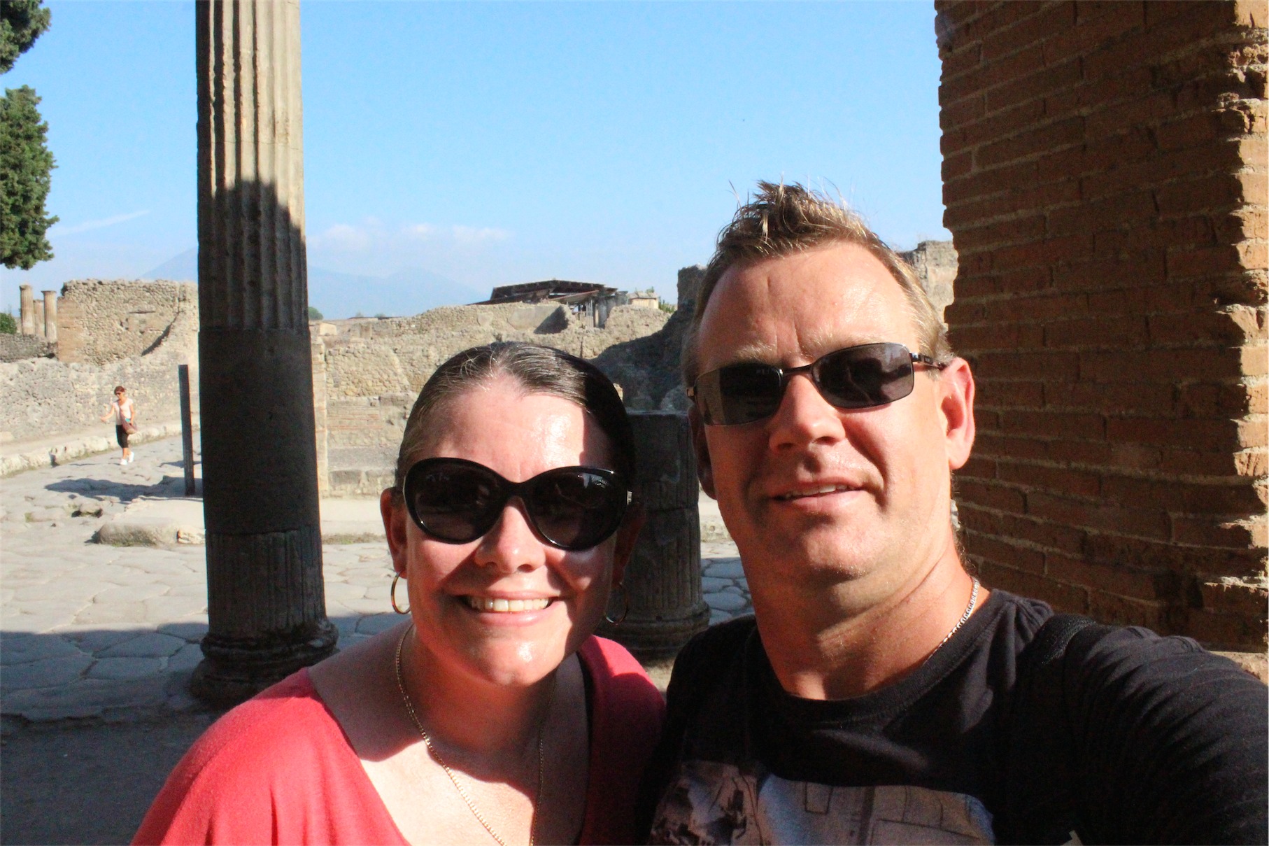 In the main area of Pompeii there is a large open area – courtyard like, perhaps a market place. On one side there is a series of sheds which hold items found during excavation. These included plaster casts of bodies they found – which was quite eerie to be looking at. In the background of the photos below, you can see Mt Vesuvius lurking ominously.