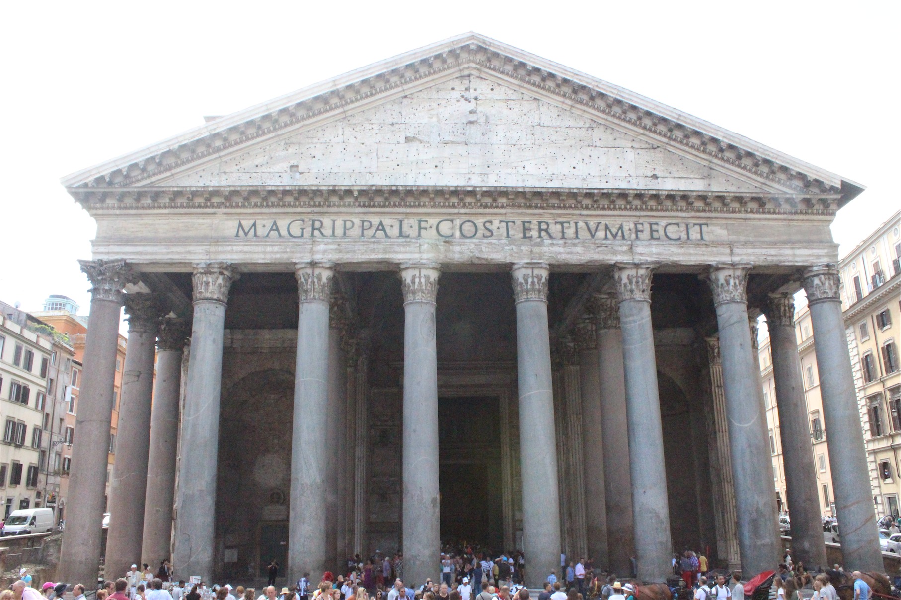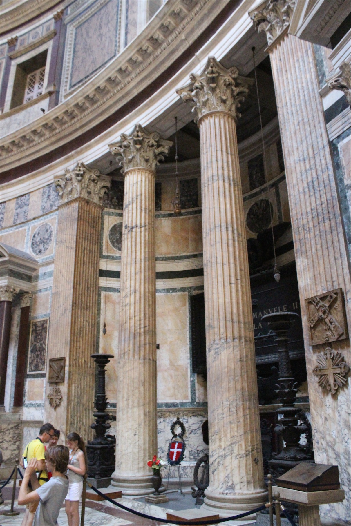Construction of the Pantheon (our next stop) was started in about 13 BC. It was torn down, rebuilt, burned to the ground and rebuilt again and again. The actual writing on the facade shows who built it and when. But, the age is not what blows you away – it’s the size. In the photo below, you can get an understanding of how big the entryway is because of the people standing below. Inside is a domed roof with a single circular skylight (oculus). While inside we were told that we had to be quiet due to a church service going on, but we were the only ones. The multitudes of people still created a noise that blocked out the service.