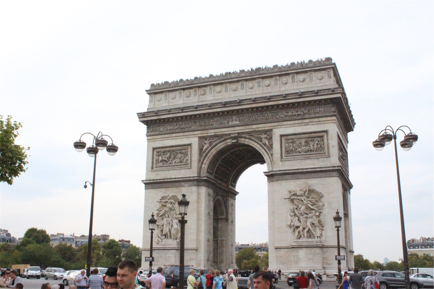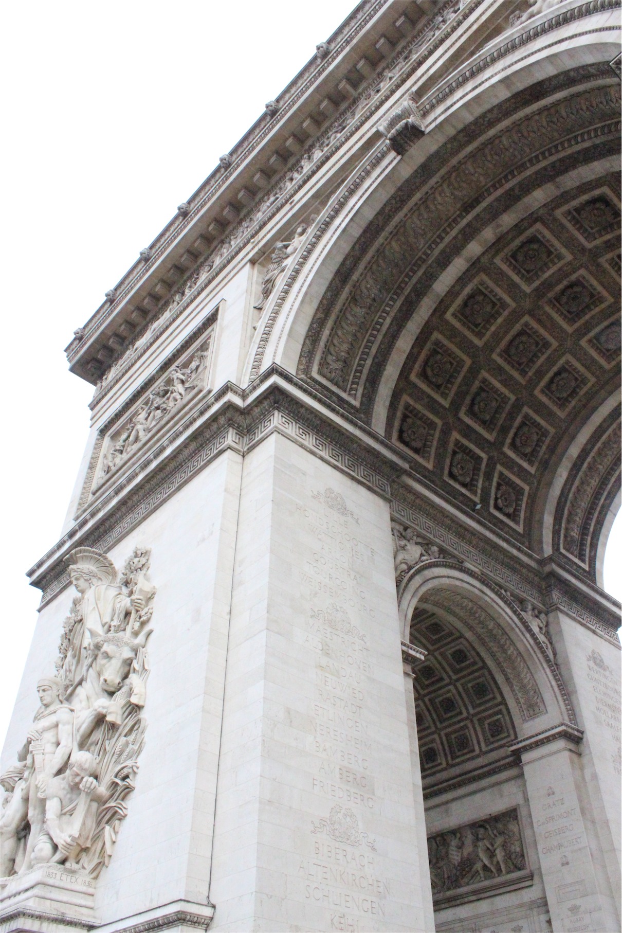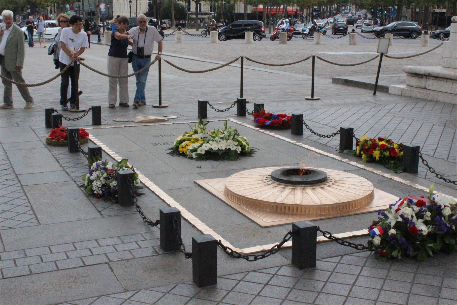 The Arc de Triomphe honours those who fought and died for France in the French Revolutionary and the Napoleonic Wars, with the names of all French victories and generals inscribed on its inner and outer surfaces. Beneath its vault lies the Tomb of the Unknown Soldier from World War I.