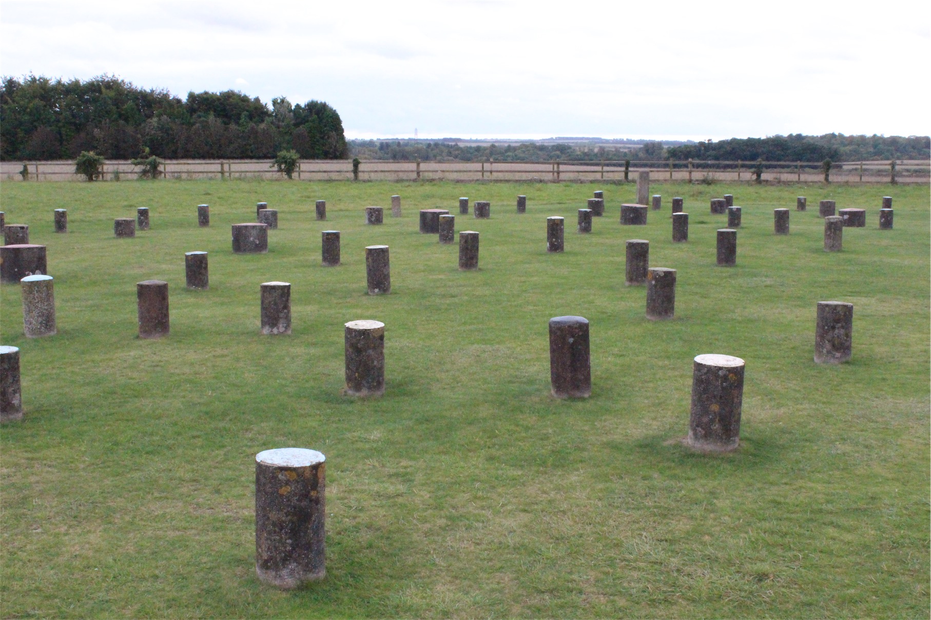 Estimated to be built about 2300 BC, it was originally believed to be the remains of a large burial mound, surrounded by a bank and ditch almost completely destroyed by ploughing. Aerial photography detected rings of dark spots in a crop of wheat, and today concrete markers replace the six concentric rings of timber posts which are believed to have once supported a ring-shaped building.