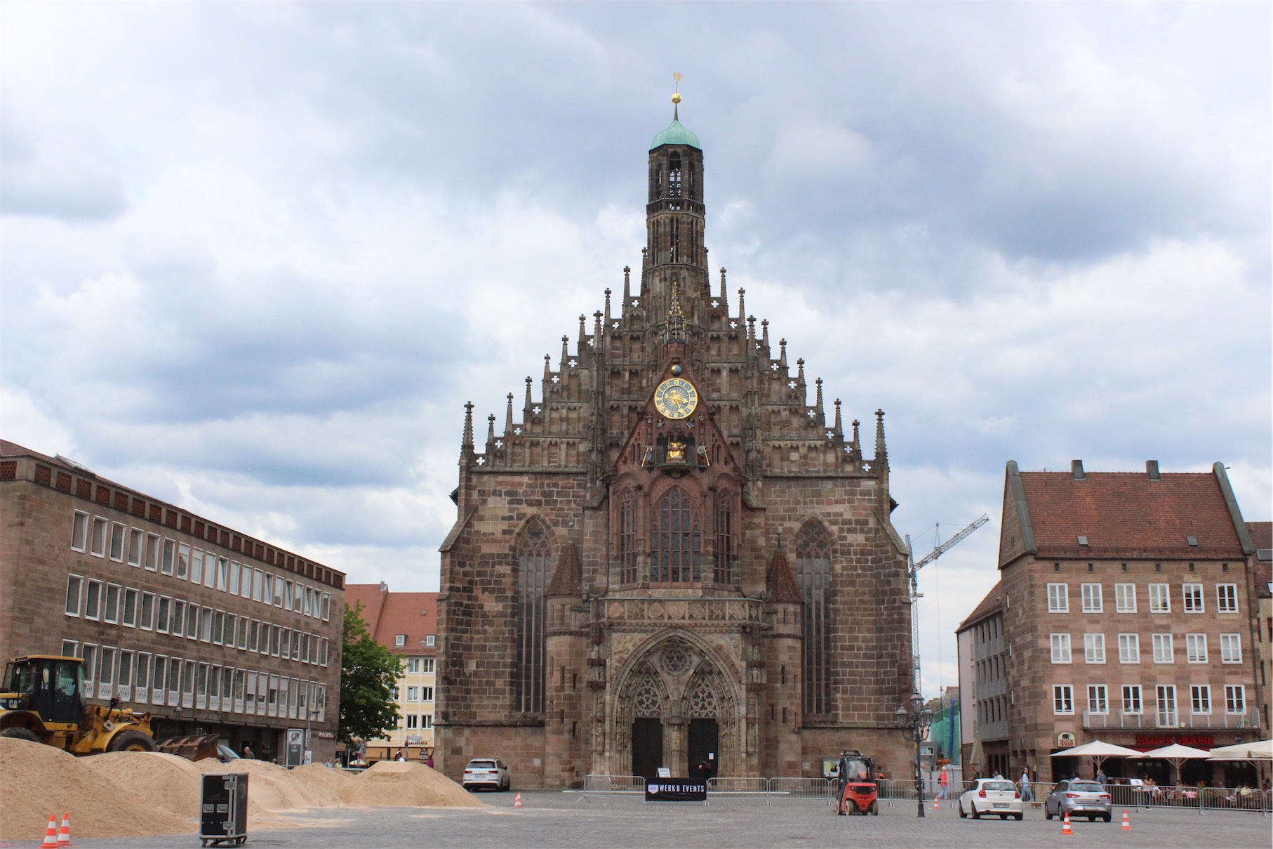 Frauenkirche (Church of Our Lady) stands behind the Haupt-Markt which was being set up for a “beach party” event that night.