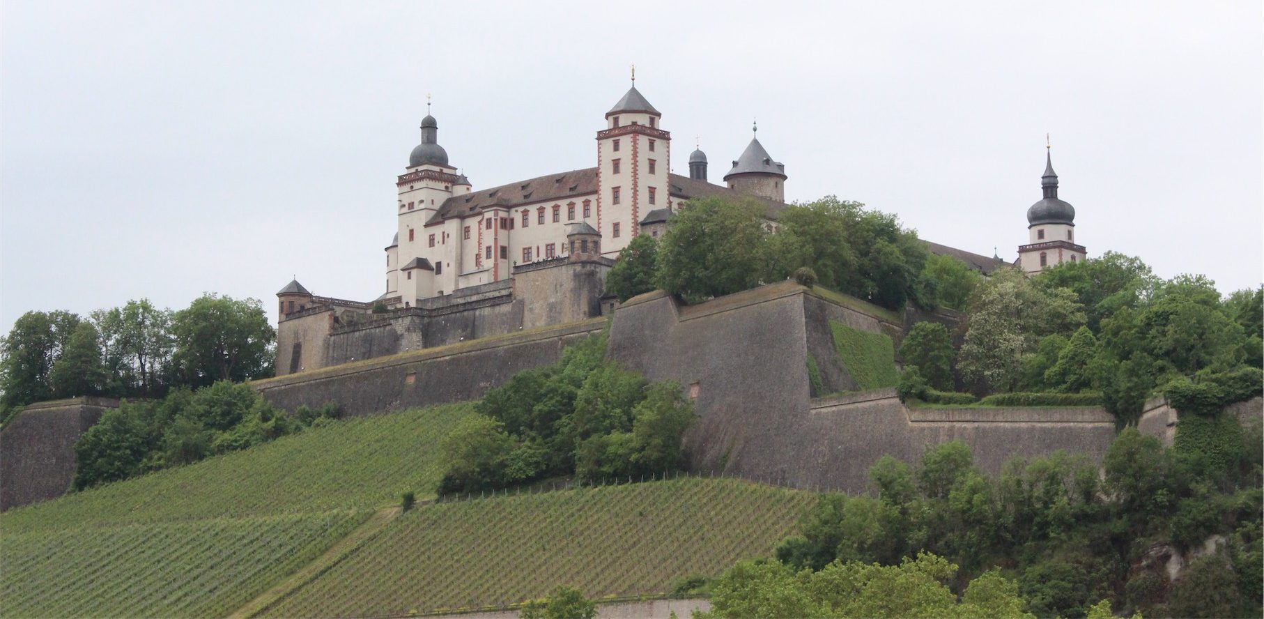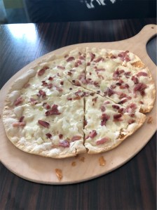 The weather was threatening to dampen our spirits, but we rolled into Wurzburg ready for some sightseeing. We parked the car and bravely headed towards the Old Main Bridge when the heavens opened. We ran for shelter and found a small cafe with other rain refugees. Little did we know that this shop, near the Neumünster Catholic Church, specialised in flamkuchen – a traditional food of this area known world wide. Imagine bread dough rolled out really thinly in the shape of an oval, covered in crème fraîche, thin-sliced onions and ham and then baked. It was amazing and a great way to wait for the rain to stop.