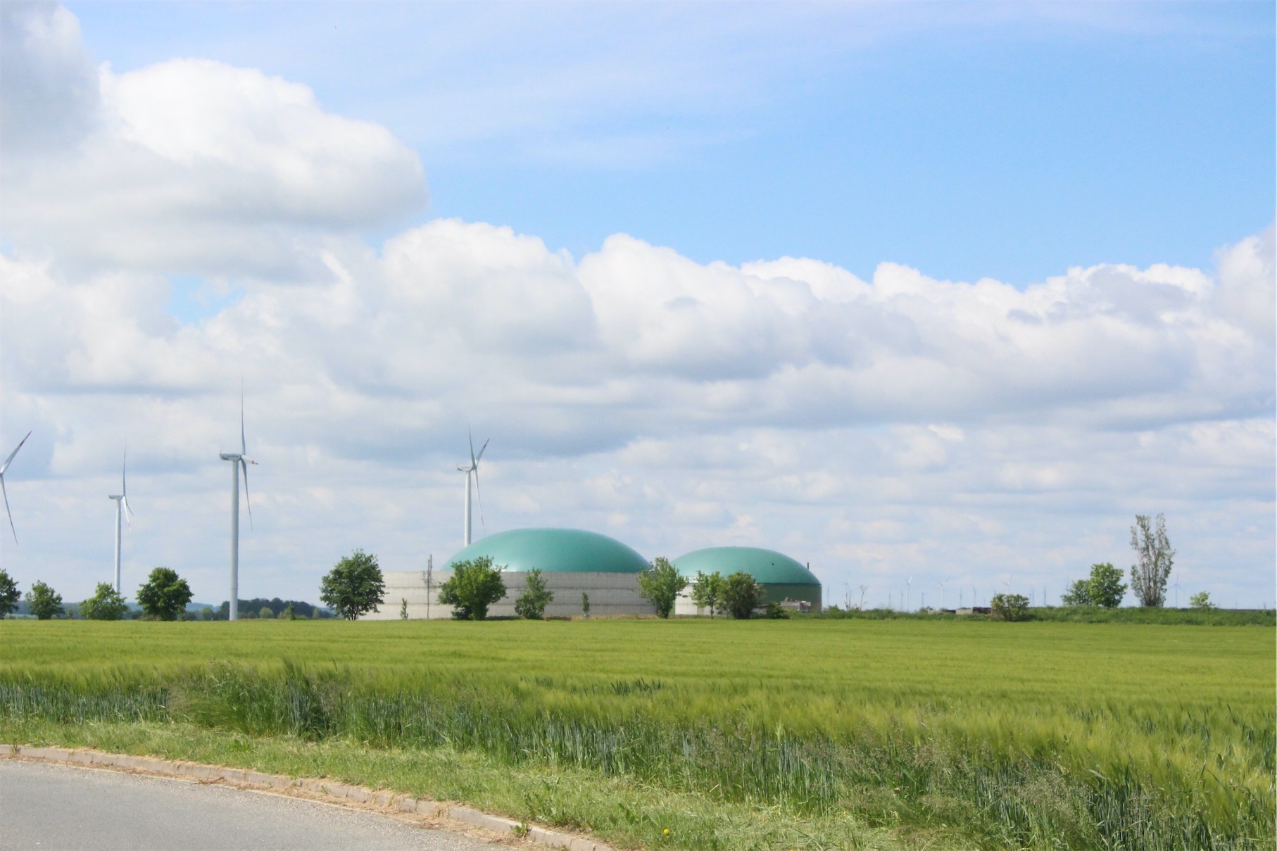 All over Germany there are biogas plants – about 9,000 of them. Germany has the largest biogas market in the world and it’s a key to the overall sustainability of the country. Farmers take their animal and vegetable waste and let it rot in huge “digesters” which causes natural biogas to be emitted. This gas is then caught in massive canopies that look like a cross between a hot air balloon and a jumping castle. You can see the green canopy in the photo below, under the wind generators which also provide renewable energy.