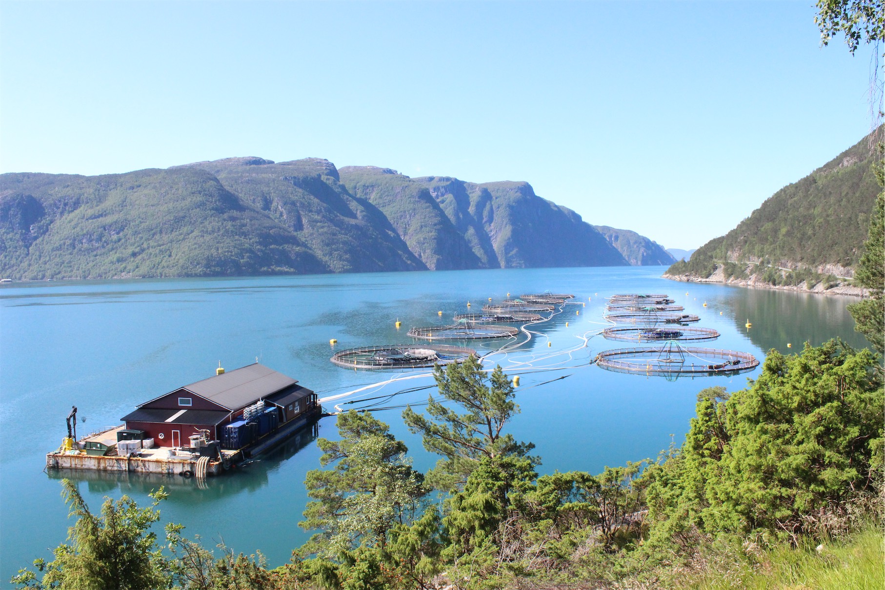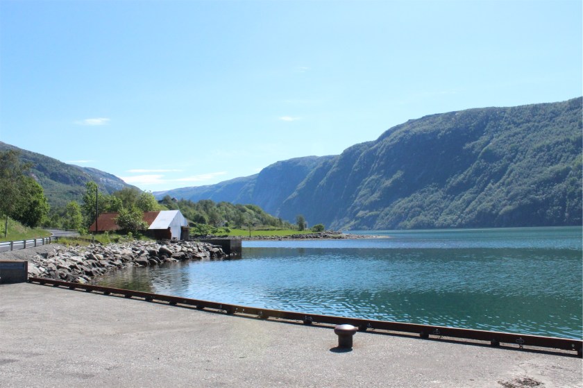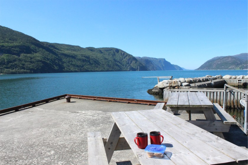 We decided to stop for a coffee on a wharf alongside the fjord. Near the wharf was a large fish farm. It’s not unusual to find salmon or trout fish farms in the cool waters of the fjords in Norway.