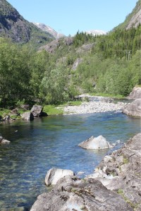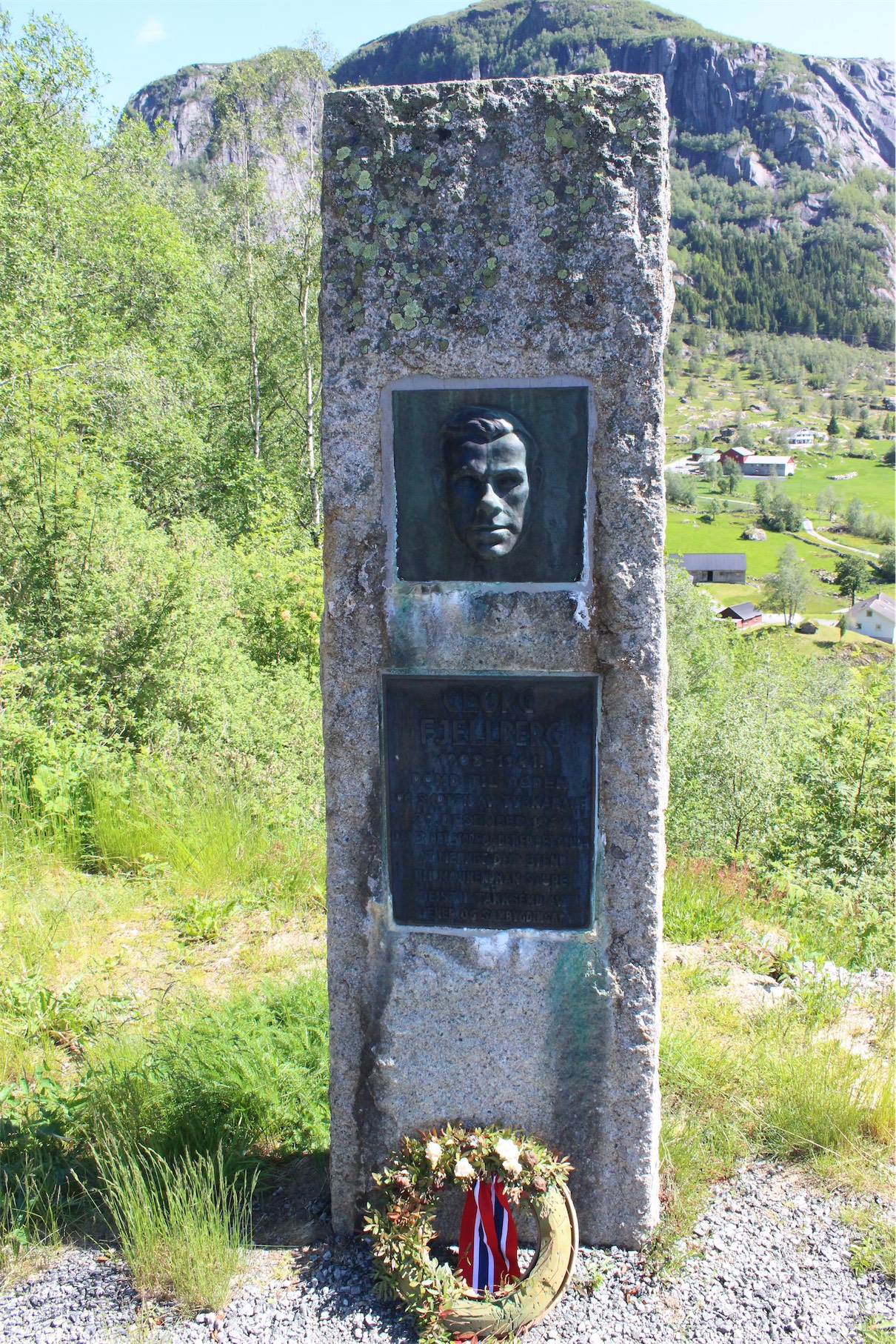 Our route took us away from the fjord past the River Ulla and up into the mountains. These pictures were taken from a great rest stop/lookout. Here we found the Georg Fjellberg Memorial Stone. Georg was part of the Norwegian resistance in WWII. After the war his neighbours and friends collected money and raised this memorial stone.