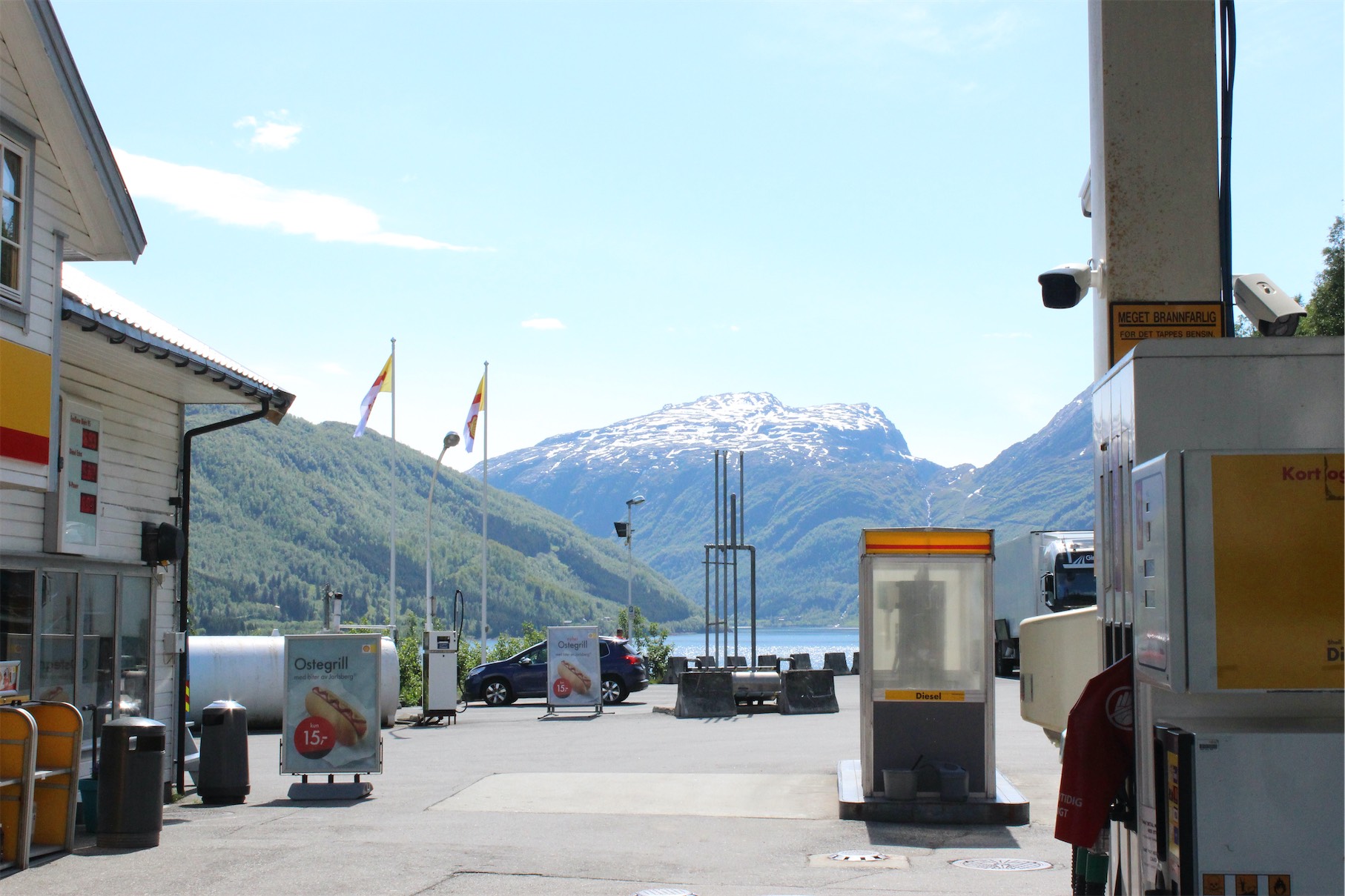 We arrived at Røldal. It’s a small village of less than 400 community members and lies in the Røldal Valley along the Storelva River on the north end of Lake Røldalsvatnet. It’s in a fairly remote location and it is unspoilt nature at its best. Even the petrol station has a great vista.
