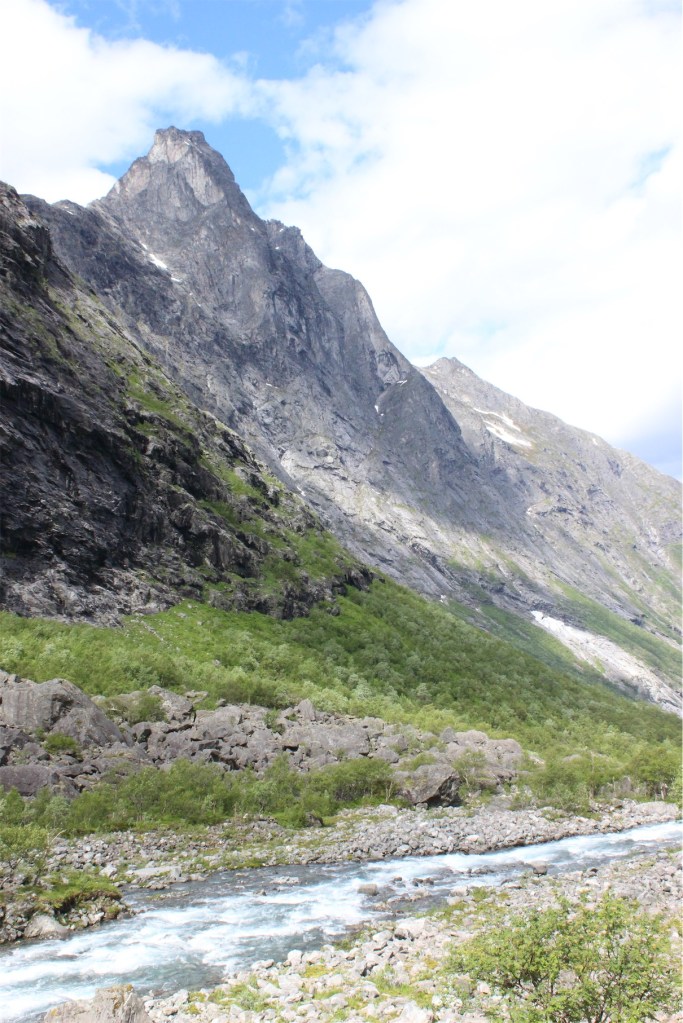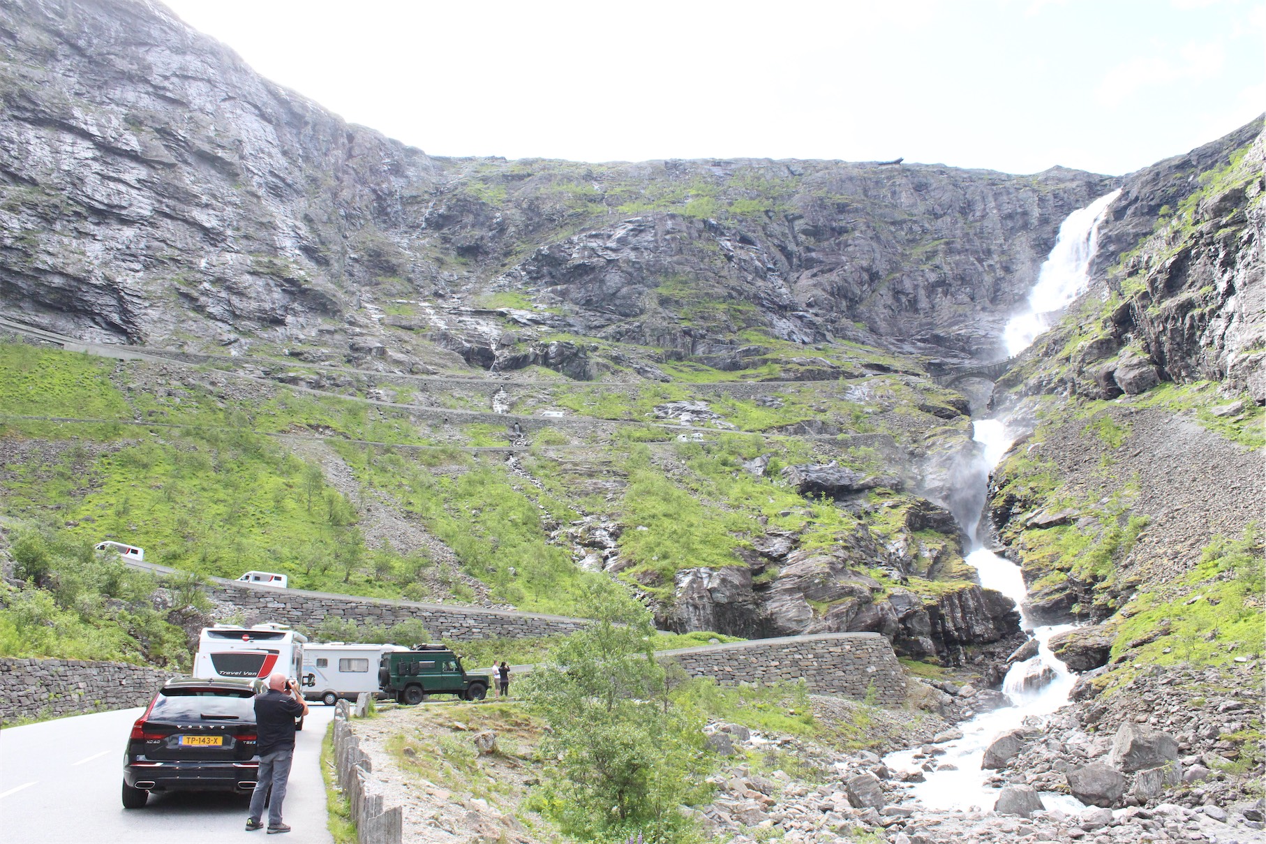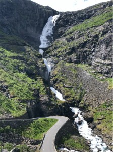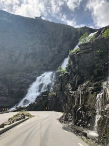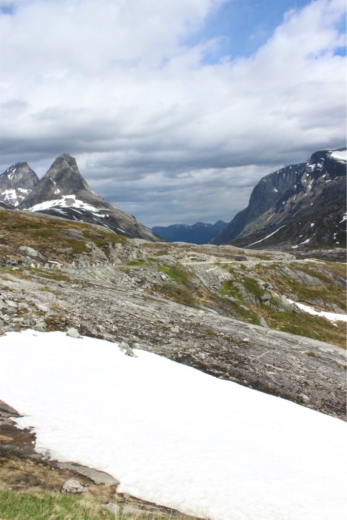We were now heading to the very well known area of Trollstigen. We enjoyed watching the dramatic changes in landscape and found a spot to pull over and have a coffee break. The temperature had plummeted and the wind was very cold so we rugged up in our coats watching some ominous dark clouds moving overhead.