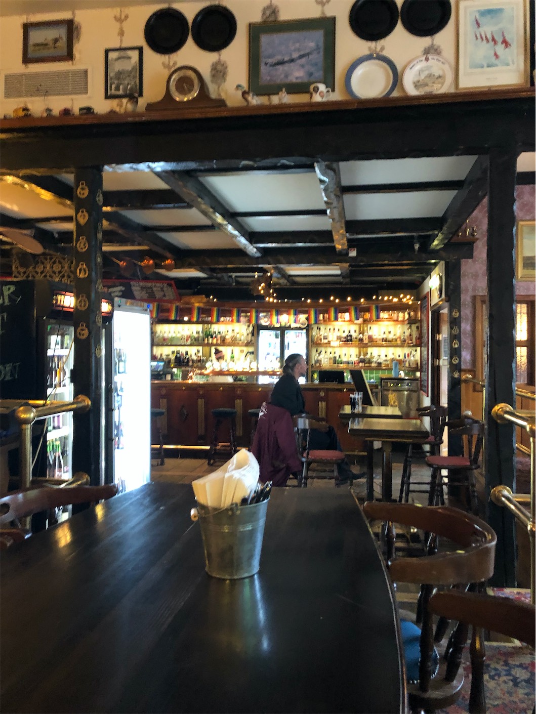 After hanging up our washing and enjoying an impromptu lift disco, we talked to hotel staff and found that there was a pub close by. We braved the rain and headed there for dinner.