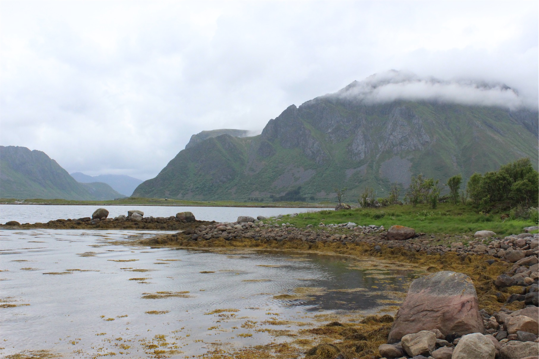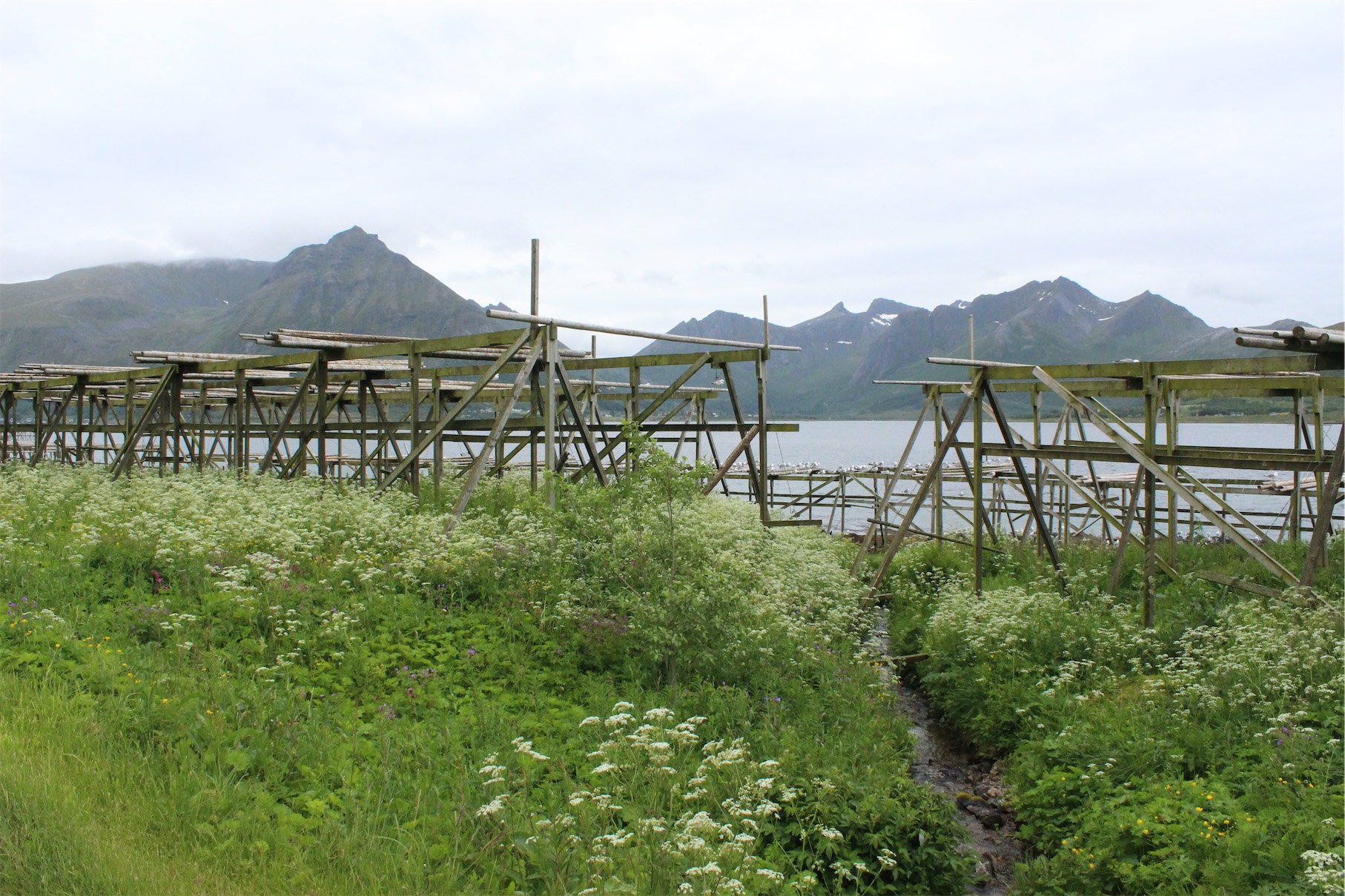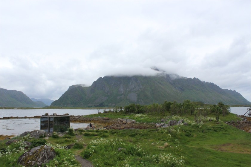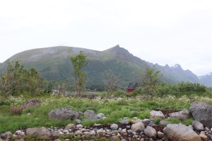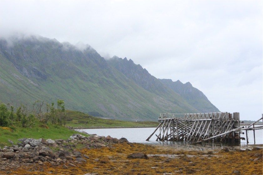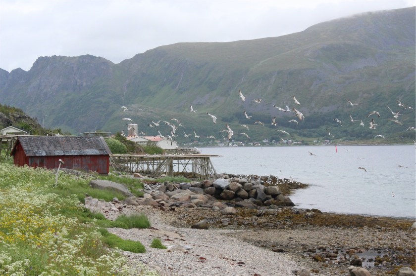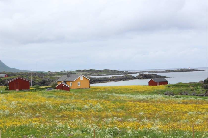 The drive along the ocean’s edge was amazing, though the weather was still disappointing the landscape was not. Fishing huts and drying racks were popular with seagulls despite there being no fish hung up yet. Wildflowers were everywhere and it was truly beautiful.