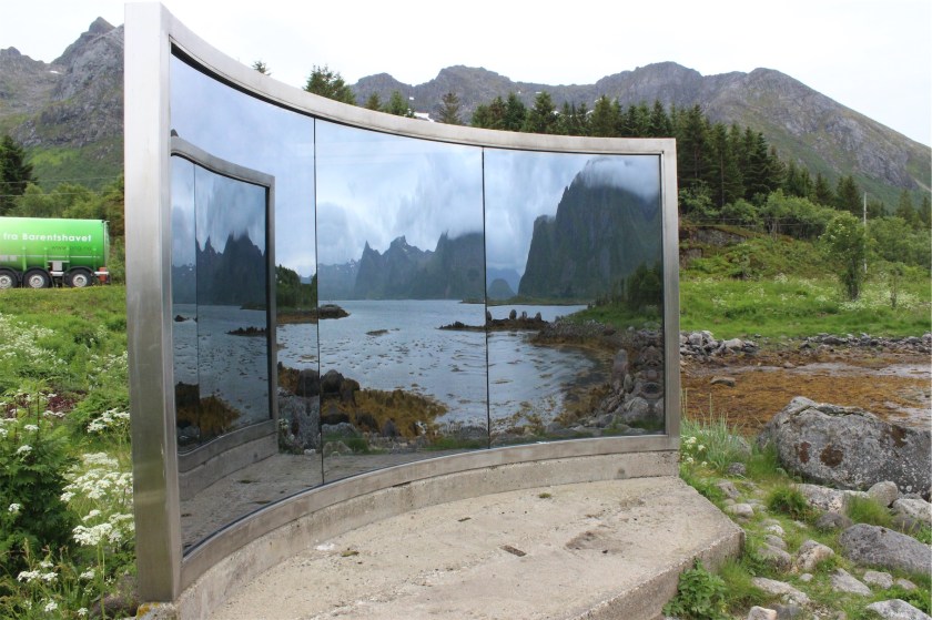 Just before the Gimsøystraumen Bridge is a beautiful sculpture by artist Dan Graham. Untitled, this is one of 35 sculptures by various artists across Norway forming the Skulpturlandskap project.