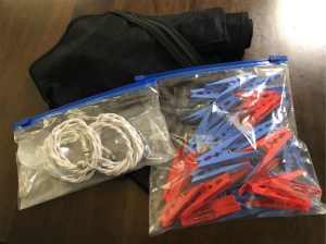 We pack a small number of pegs because although the line can be used peg-less, we found that it doesn’t work as well. Additionally, sometimes places we stay at will have a drying rack but no pegs!